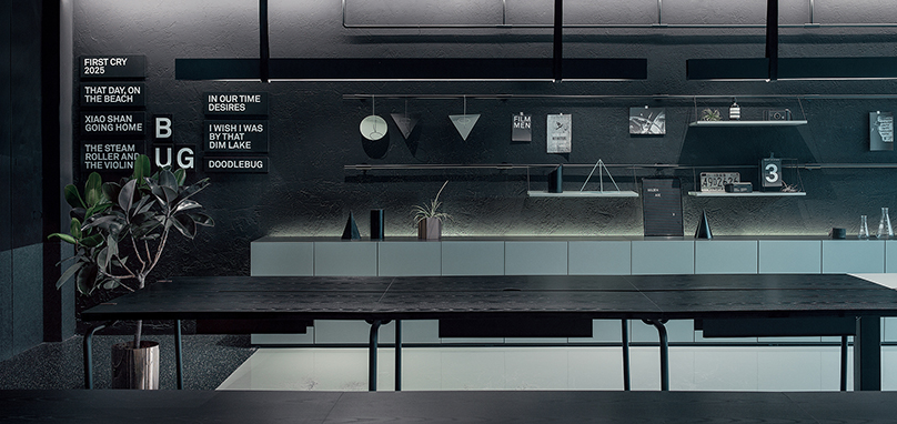 在電影辦公室的中心,辦公室裝修有一個小型投影室。 RIGI創造了純白色區域; 一個抽象的超現實空間,辦公室裝修粉紅色的裝置增添了戲劇感。材料和顏色主要是黑色和白色,就像電影本身一樣。不同質地的黑色材料共同傳達出不同的感受。辦公室裝修墻上的文字是導演的第一部電影的名字。“第一次哭泣”被視為這個空間的名稱,因為嬰兒的第一次哭泣給人的感覺是最真實的。